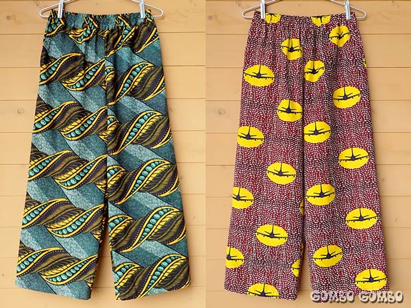 カラフルな西アフリカの布、パーニュを使って作っているストレートパンツ♪ 新柄のパンツが続々と完成しています!! このストレートパンツは、わたり幅が広めなので個性的な柄がしっかり見えて着心地も楽チンです。素材はコットン100%でウエストはゴム、両サイドにポケットが付いています☆