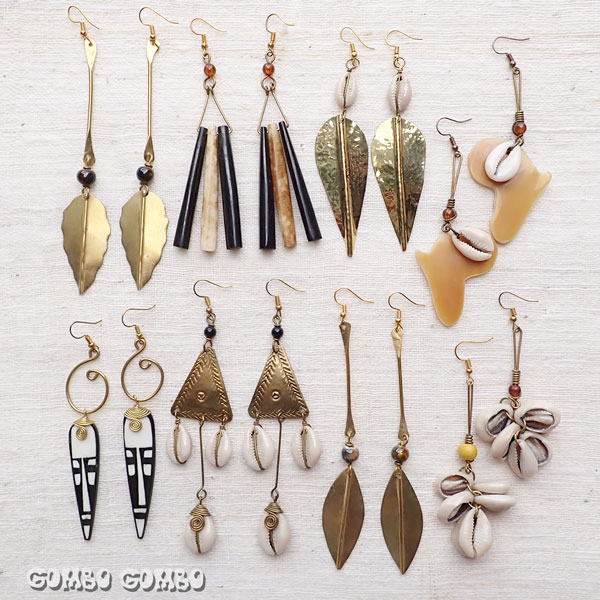 西アフリカ、コートジボワールで見つけた素敵なピアス♪ インパクトがある大きめサイズで、トップがゆらゆら揺れるデザインがとてもお洒落です。牛の骨や古くから生命や繁栄の象徴とされている子安貝など、西アフリカならではの素材を使ってあって、カラフルなアフリカ布はもちろん、シンプルな洋服との相性も抜群のピアスです☆