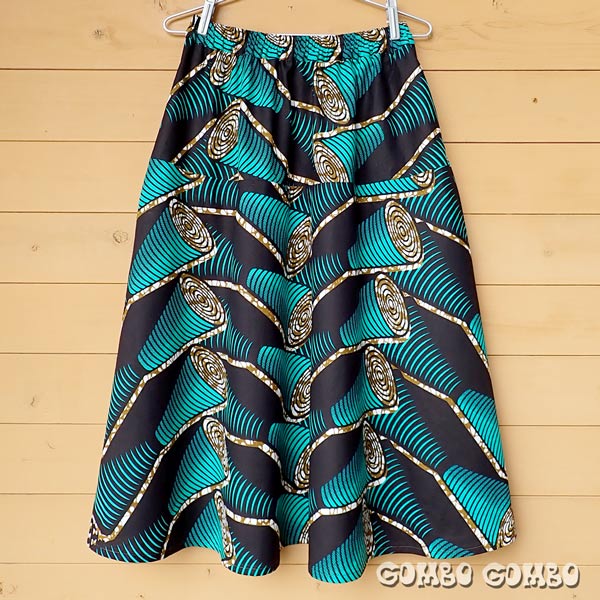 西アフリカ、セネガルで作られた膝下丈のフレアスカート♪ カラフルな色合いと個性的な柄がアフリカらしくてとても素敵です。ウエスト部分の前面はスッキリしていて、後ろ側のみゴム入りでファスナーが付いています。両サイドにポケット付き。裾に向かってボリュームがある、綺麗なシルエットのお洒落なスカートです☆