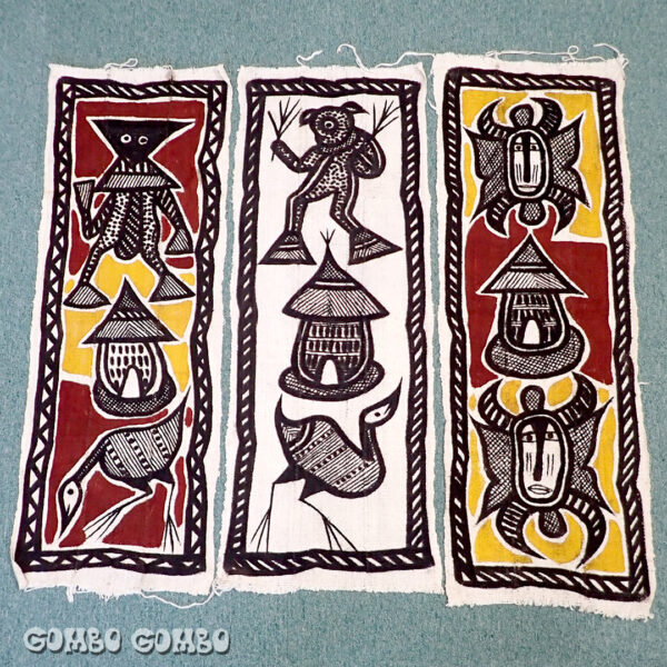 西アフリカ、コートジボワール北部の町コロゴで製作されたコロゴ布のタペストリー♪ 手紡ぎの綿糸を帯状に手織りしてつなぎ合わせた布に、仮面や鳥、精霊などセヌフォ族の神話に基づいた伝統的なモチーフが天然染料を使って手描きで描かれています。アフリカらしい素敵なタペストリーはお部屋のインテリアとしてオススメですよ☆