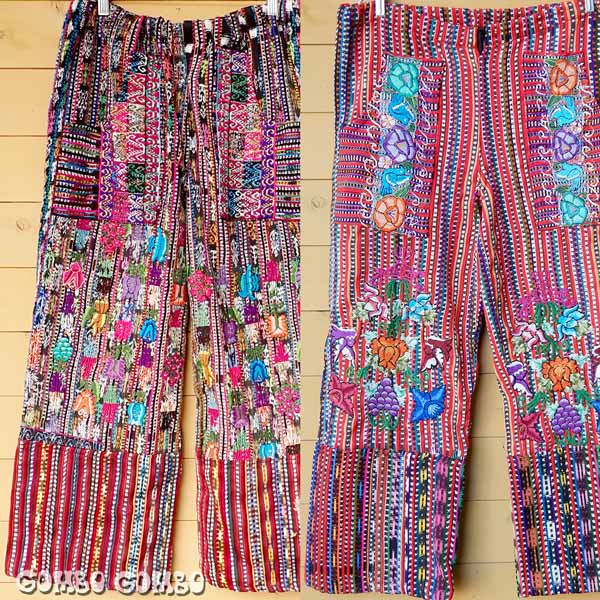 中米グアテマラの南西部にある町、ソロラの男性が着用している伝統的な民族衣装のパンツ♪ 手織りで織られた厚手の色鮮やかな生地に、カラフルな幾何学模様や植物のモチーフなどが刺繍されています。 1つずつ色や柄が異なり、それぞれにとても格好良いパンツです。 黒ベースの物や柄違いもありますよ☆