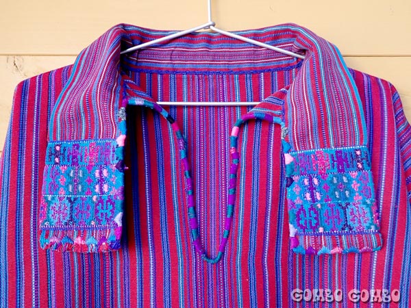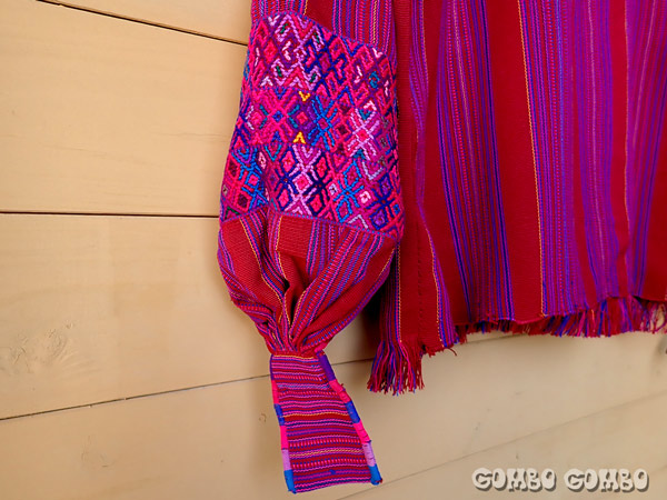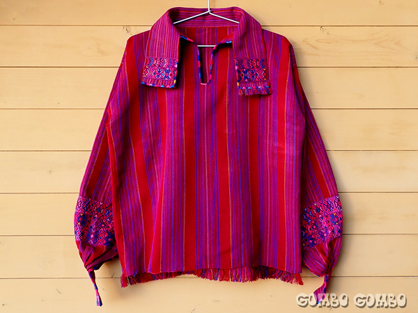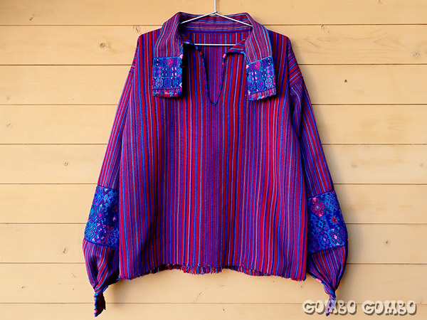 グアテマラ北西部の山岳地帯に位置する村、サン・ファン・アティタン(San Juan Atitán)の男性たちが着ている素敵なシャツの古着♪ 厚手の手織り生地で作られたシャツは、襟と袖に細やかな模様の織物が付けられていてとてもお洒落。初めてグアテマラを訪れた時に色々な村を巡って、1番格好いいと思った男性の民族衣装です☆