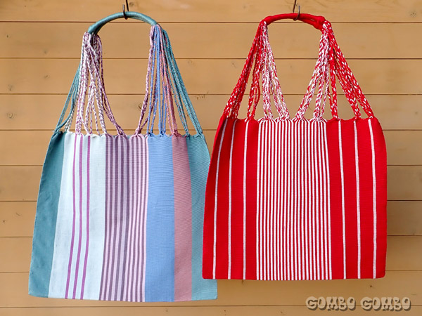メキシコ、チアパス州の手織りのコットン布を使って作られたお洒落なハンモックバッグ♪ 上品でシンプルなストライプ模様は普段使いはもちろん、お仕事用でも活躍できる使いやすいデザインです。A4サイズが入る大きさで、太目の取っ手部分が丈夫で持ちやすいオススメのバッグです☆