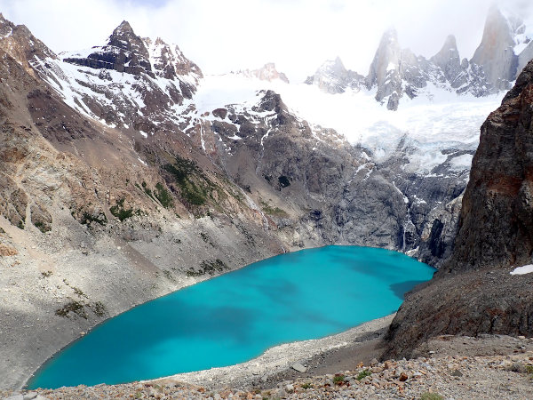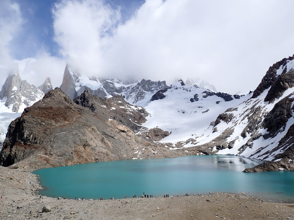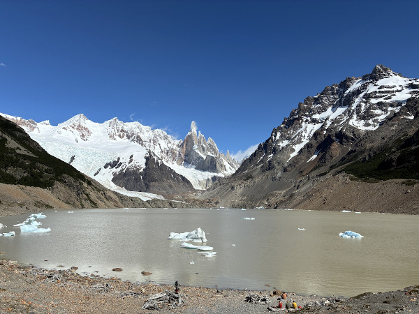 1日目はフィッツ・ロイ山(標高3,405m)直下のロス・トレス湖を目指すルートを歩いて往復約22Km。最初の登りと、最後1時間以上続く岩場の登りが急勾配でハードでしたが、次々に変る景色が絶景で感動の連続でした。やっと辿り着いたロス・トレス湖は強風が吹いていて極寒!! フィッツ・ロイ山の山頂は雲で隠れていたけど、すぐ隣にある氷河と美しい湖も見られたし、途中でフクロウや大きなマゼラン・キツツキにも遭遇出来て大満足でした。